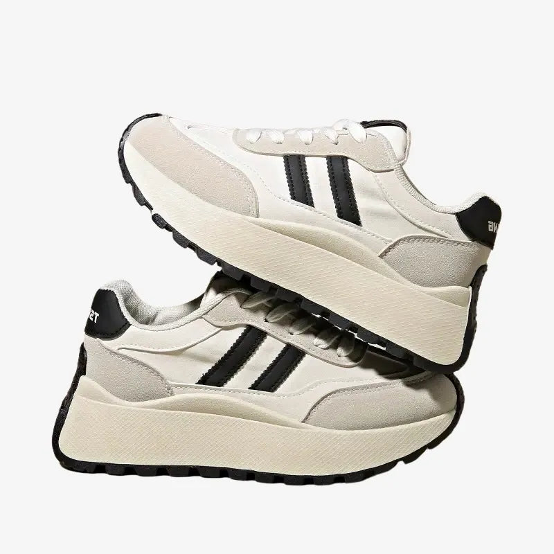 Mélange de suédine et textile respirant, cette paire offre un bon équilibre entre douceur, légèreté et résistance. Les bandes noires contrastantes ajoutent du caractère sans surcharger le design.
