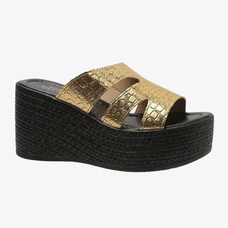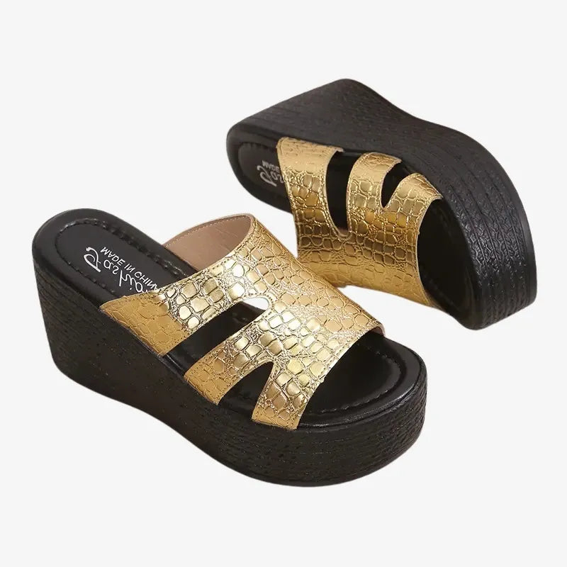 Le dessus imitation cuir crocodile doré est non seulement esthétique mais aussi résistant. La coupe ouverte permet une bonne aération, parfaite pour les journées chaudes.