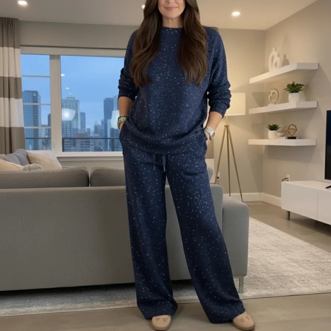 Composé d’un pull et d’un pantalon assorti, il propose une coupe fluide qui sublime la silhouette sans la serrer. Le motif moucheté discret, rehaussé d’un léger effet scintillant, apporte une touche de raffinement idéale pour un look chic et décontracté.