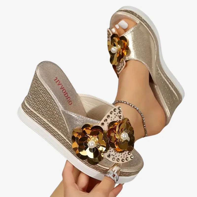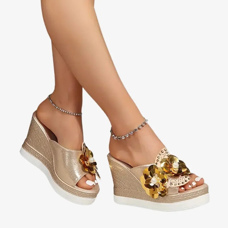 Sublimez vos tenues avec la Gold Bloom , une sandale à plateforme qui ne passe pas inaperçue. Son éclat doré et ses ornements floraux en font une pièce glamour idéale pour vos événements spéciaux.
