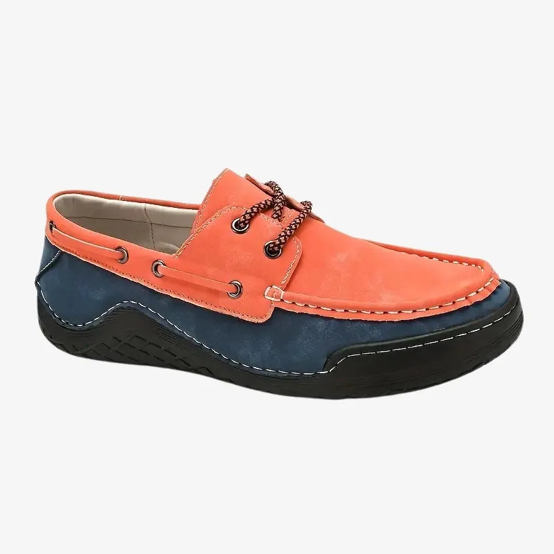 La chaussure Nautik Duo s’inspire des classiques bateaux tout en y ajoutant une touche urbaine moderne. Avec son duo de couleurs orange vif et bleu marine, elle attire l'œil tout en gardant un style élégant.