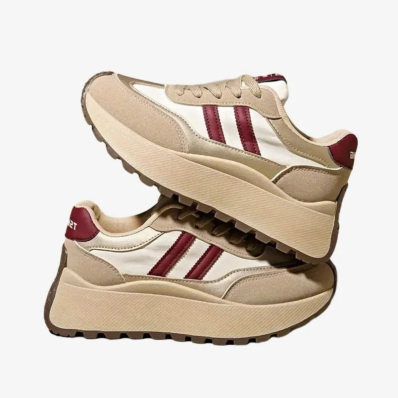 Le mélange de beige doux et de bandes bordeaux crée un contraste visuel dynamique. La combinaison de cuir synthétique et de suédine renforce l'effet haut de gamme tout en conservant un esprit casual assumé.